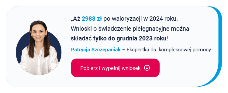 Świadczenie pielęgnacyjne przysługuje osobie, która zrezygnowała z pracy na rzecz opieki nad osobą z orzeczeniem o znacznym stopniu niepełnosprawności. Ile wynosi świadczenie pielęgnacyjne? Wysokość świadczenia wynosi w 2023 r. aż 2458 zł i podlega corocznej waloryzacji. W 2024 jego kwota będzie wynosić według naszych ekspertów aż 2988 zł, ale wnioski o świadczenie w związku z opieką nad osobą dorosłą można składać tylko do końca grudnia 2023 roku. Później będzie to niemożliwe przez zmiany w ustawie, dlatego nie wolno zwlekać.